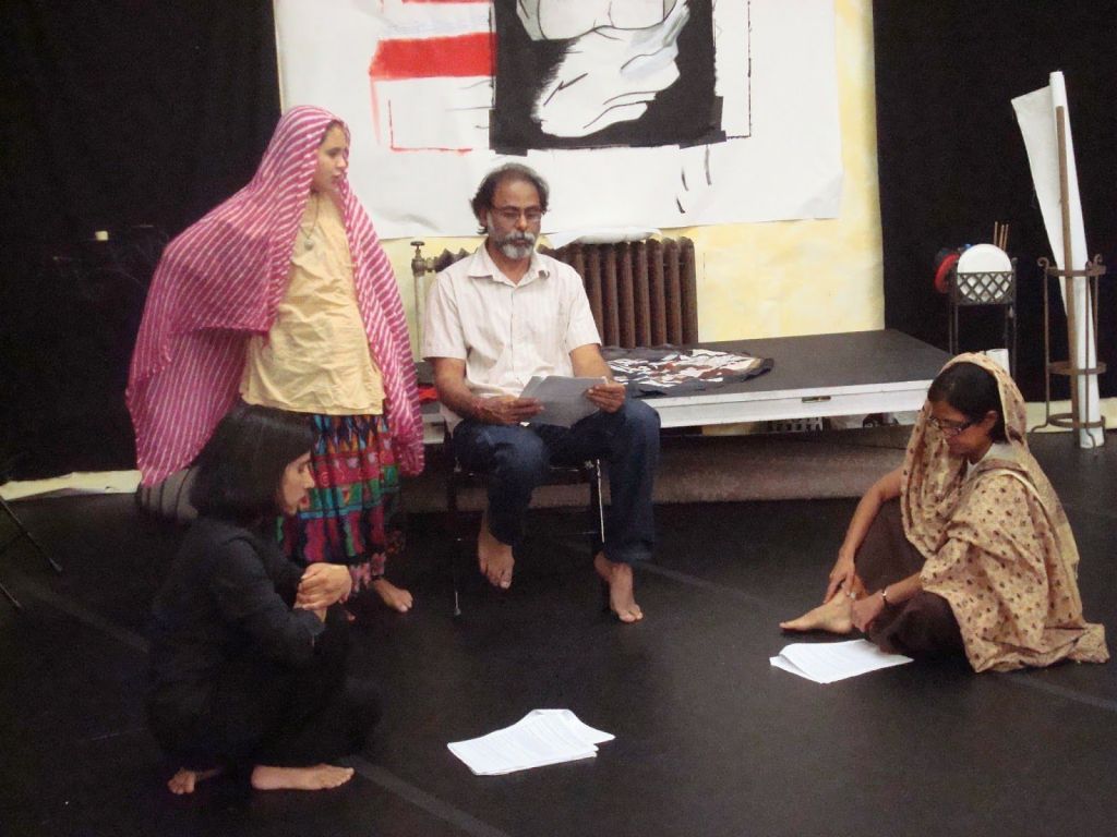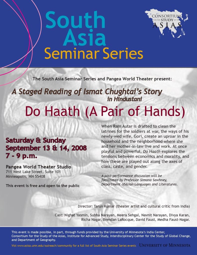 A group of 10 amateur actors — mostly from Indian and Pakistani backgrounds — came together in the Twin Cities of Minneapolis-Saint Paul during summer of 2008 to read the works of authors such as Nazeer Akbarabadi, Ismat Chughtai, Saadat Hasan Manto, and Habib Tanvir in Hindi and Urdu. The collective called itself Parakh Theater Group and worked together for two months to develop a play based on Ismat Apa’s story, Do Haath (A Pair of Hands). The play was staged in Pangea World Theater in September 2008. With Tarun Kumar as the artistic director, this effort was organized by Richa Nagar and was supported by the Pangea World Theater and the University of Minnesota. Below are some glimpses from rehearsals of Do Haath.